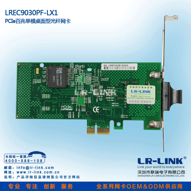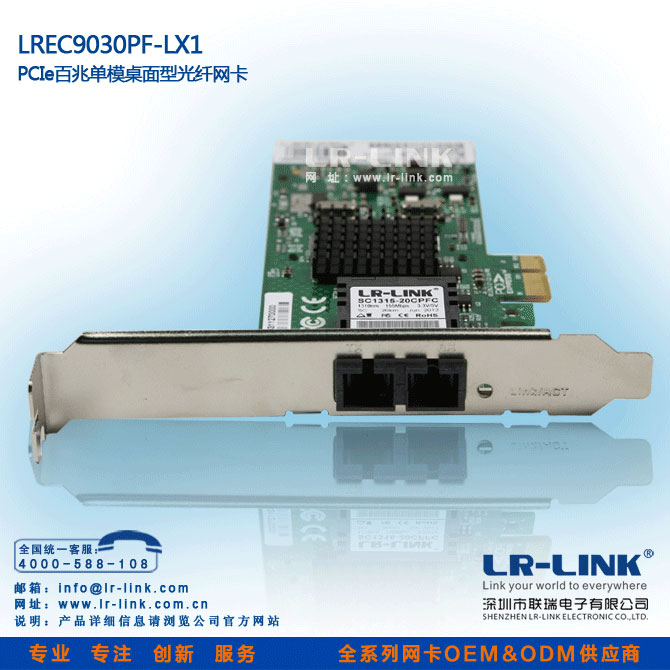 LREC9030PF-LX(百兆单模光纤网卡)具有极高的性能和可靠性,中断调节等提高性能的同时,能显著降低CPU占用率。与PCI-Express x1插槽的兼容设计可用在新的PCI-Express台式机总线架构上实现高性能的网络传输。该款控制器符合RoHS规定,采用了符合欧盟最新指令(自2006年7月生效)的规定无铅技术,减少有害物质的使用。
