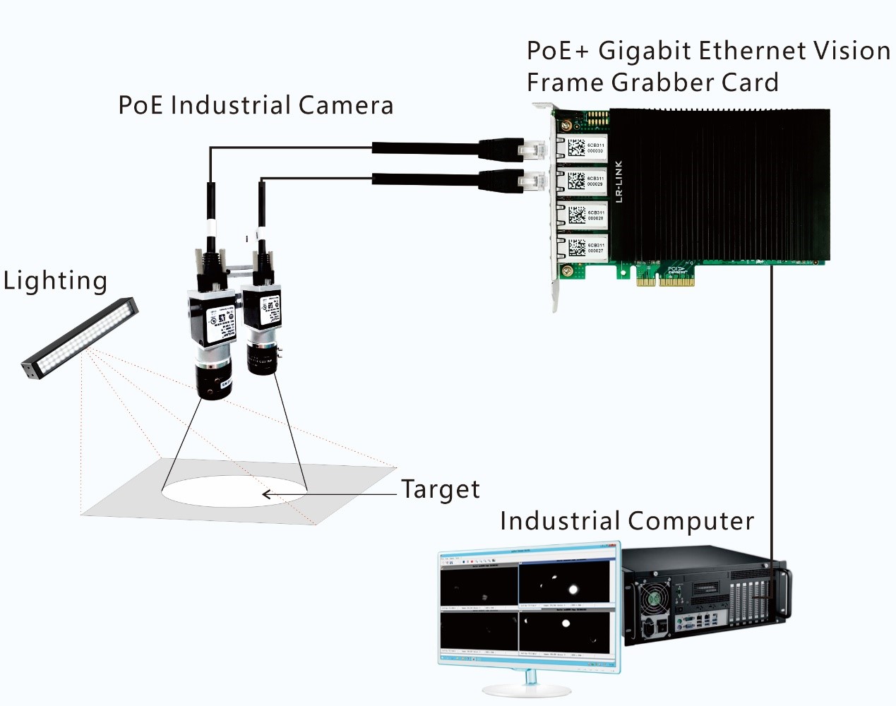 针对不同检测需求采用的不同检测方案,智能视觉系统工作流程采用通过工控机上安装了的PoE网卡(千兆PoE网卡或万兆PoE网卡)把工业相机里采集到的数据传递给到视觉程序进行分析计算。以实现现场多需求检测要求。
