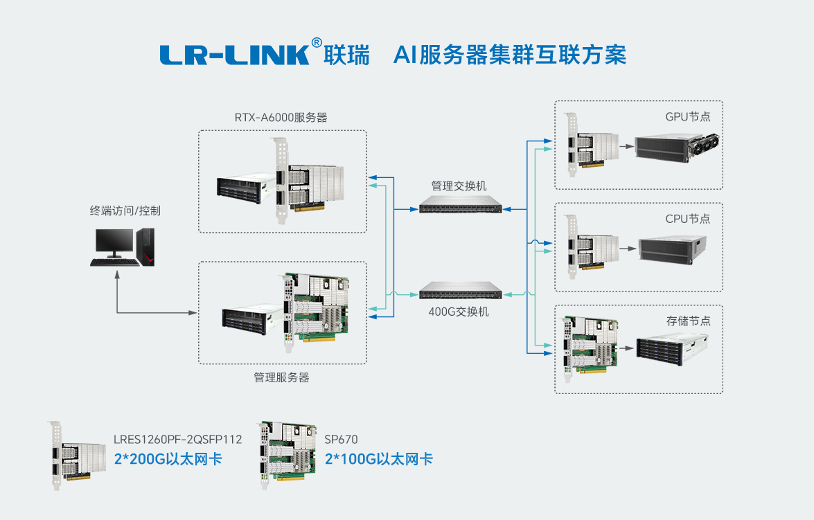 作为AI高速网络传输与应用布局标杆企业,联瑞聚焦客户核心需求,为精准匹配AI算力场景下的高效传输支撑诉求,公司战略引进华为系列网卡产品,助力AI算力集群建设高效落地。具体方案中,联瑞以华为2*100G以太网卡SP670为核心,搭配2*200G以太网卡LRES1260PF-2QSFP112,创新推出AI算力集群互联解决方案,通过软硬件协同优化,有效盘活算力资源,为AI算力集群搭建起“高速、稳定、安全”的互联桥梁。