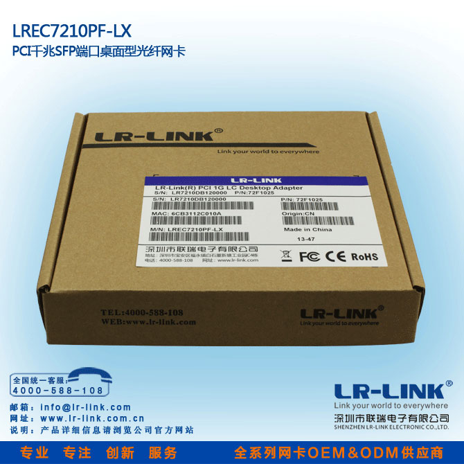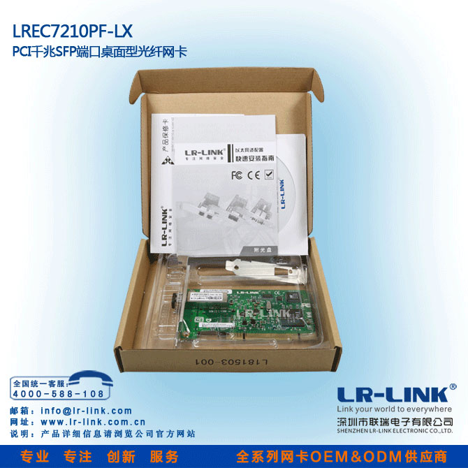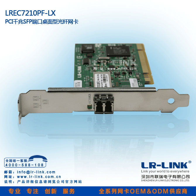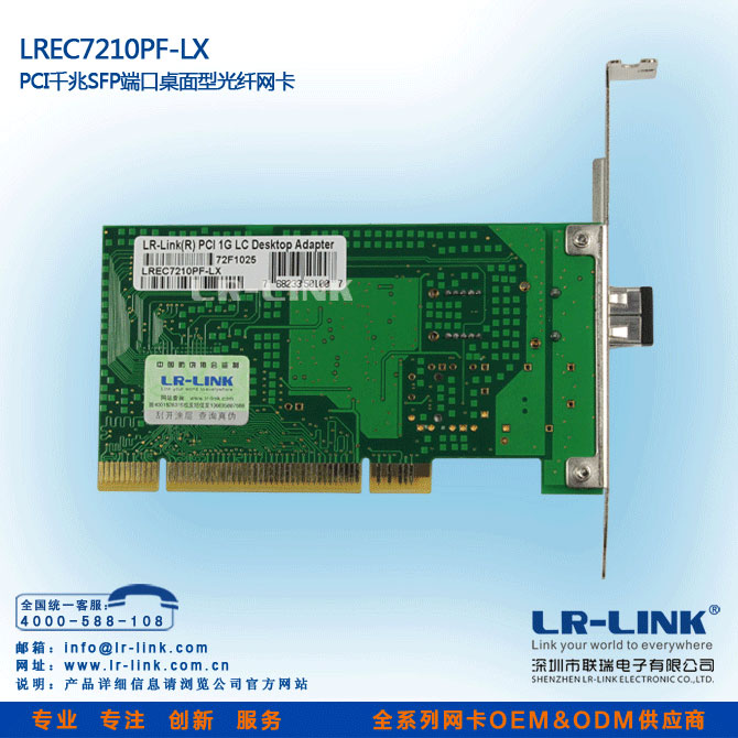 LREC7210PF-LX—PCI千兆单模光纤网卡是深圳市联瑞电子有限公司为推广光纤到桌面(FTTD)方案,而研发的一款真正意义的高性能的32位PCI千兆单模光纤网卡,也是市场上唯一的一款PCI光纤网卡.它将更好运用于各种台式机PCI插槽(目前市场千兆光纤网卡都是PCI-X或PCI-E插槽),而不用去购买昂贵的服务器主板。支持无盘启动,将实现真正意义的全光纤网吧,为连锁网吧运营企业,打造高档高性网吧,奠定了坚实的硬件基础。已在广州、长沙、天津等地政府机关,网吧市场得到成功运用。